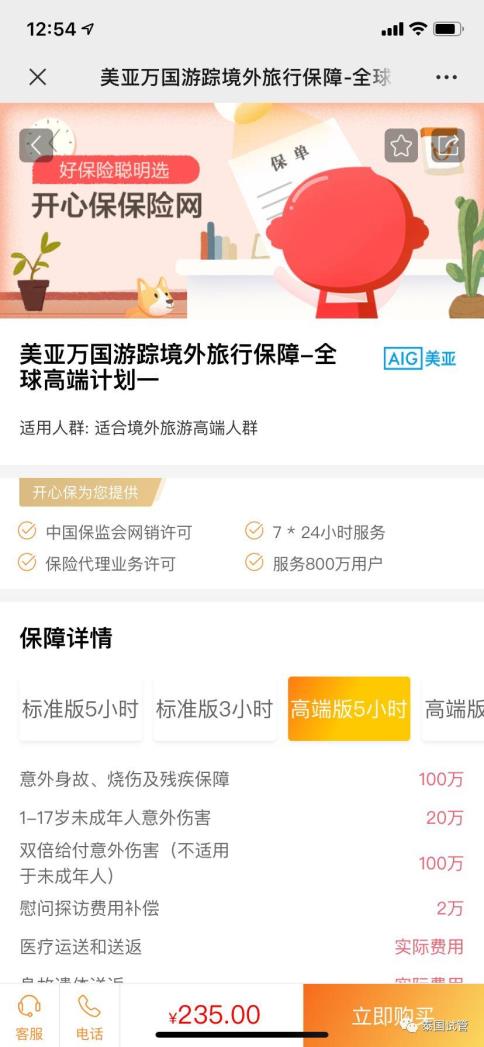 小编还替咱们一切的用户拨打了保险企业客服电话,在保险采办顺利后,投保日期此前假设行程产生变化是能够直接申报全额退费,可是记得一定是投保日期此前喔。假设是在投保日期以后变化退保,那就不能退费了。此外咱们买境外医疗保险,还应清晰保险范畴。往往大多数境外游览医疗保险含盖下列内容:医疗费和住院费、牙科紧急状况、24小时紧急医疗服务、意外灭亡,紧急疏散等,紧急医疗营救。含盖医疗运送和送返、身故尸体/骨灰送返、亲属前往解决后事抵偿、亲属慰劳拜望抵偿等等。上述保险也一样含盖这类,详细大家能够看看条款。